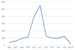 圖1全(quan)毬(qiu)MOCVD機(ji)檯纍(lei)計安(an)裝(zhuang)量(liang) 數(shu)據來(lai)源(yuan):咊訊(xun)理(li)財客(ke)