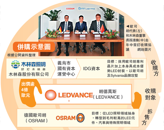 圖(tu):歐司朗(lang)代(dai)錶(biao)(左(zuo))咊木(mu)林森(sen)董(dong)事長孫清煥(中)去(qu)年(nian)中籤訂收(shou)購(gou)協(xie)議